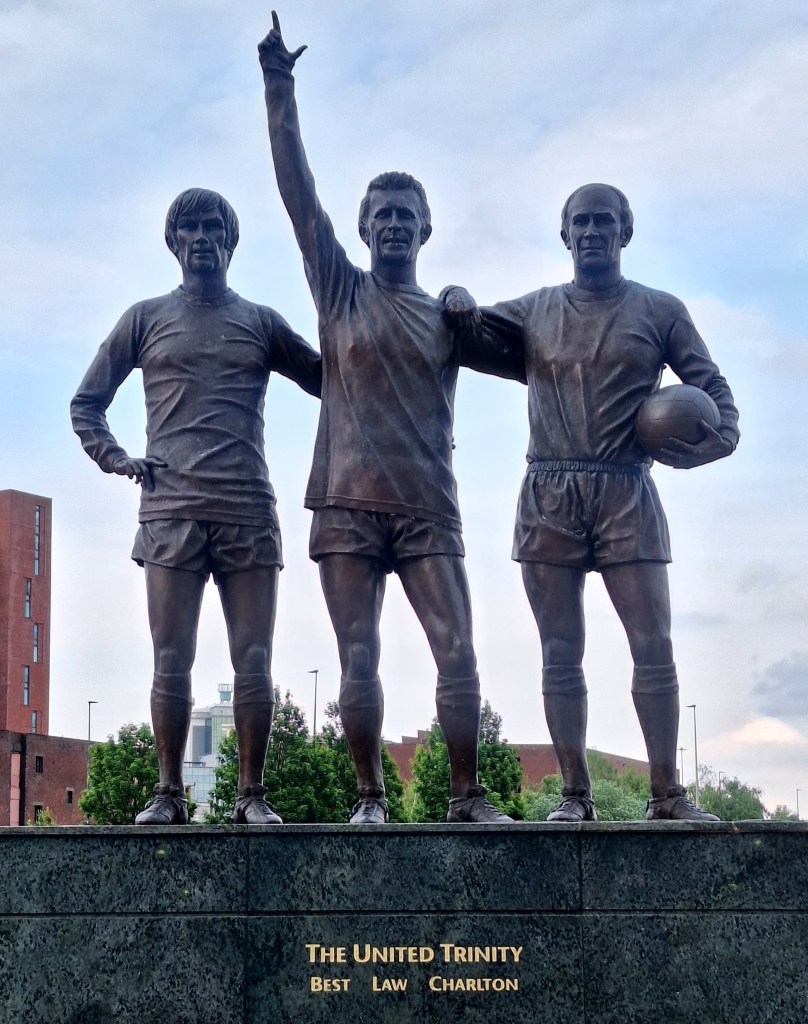 A statue dedicated to footballers George Best, Denis Law, and Bobby Charlton.